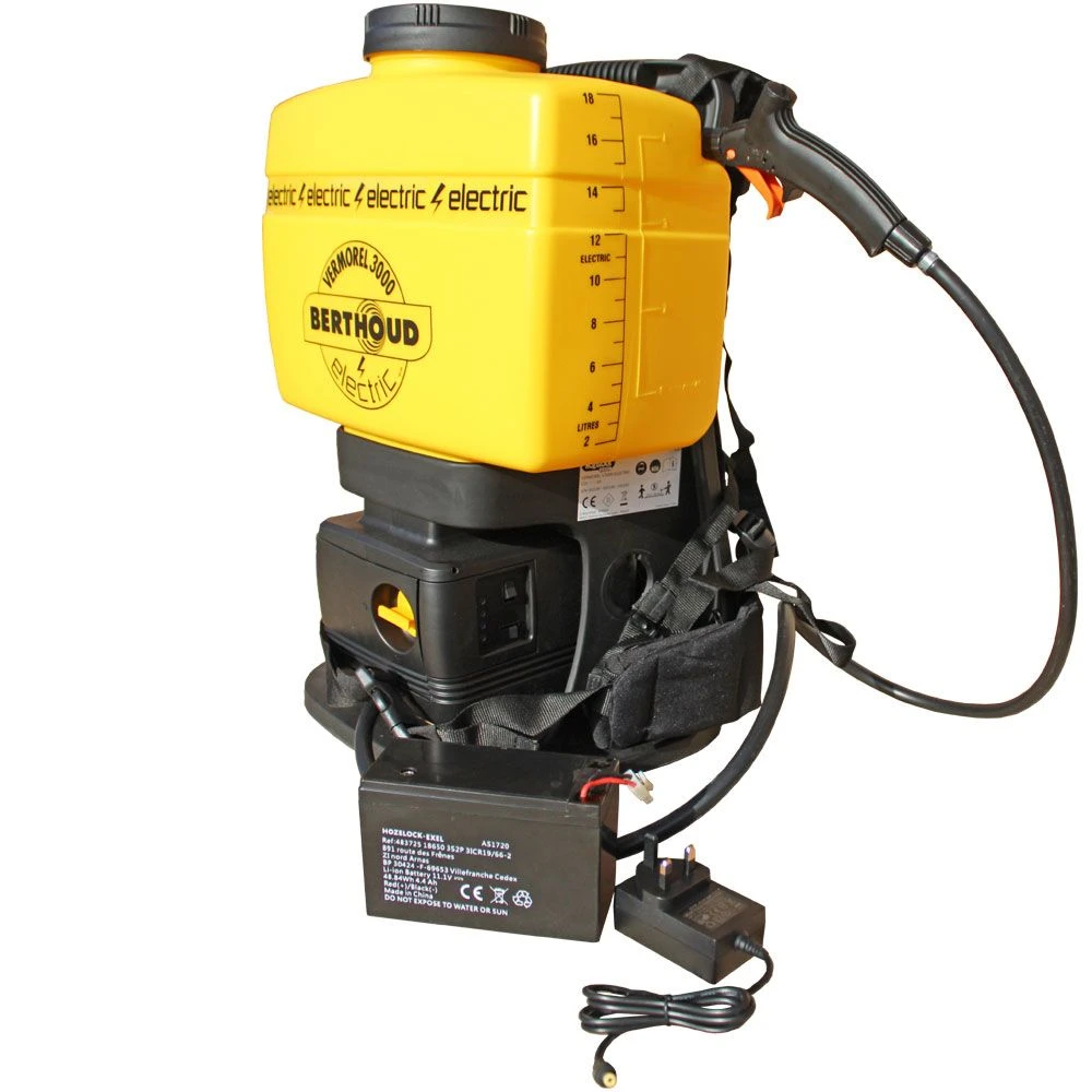 The industry benchmark for electrically powered knapsack sprayers from Berthoud. Battery sprayer powered by a single 12V Lithium-ion battery. The Berthoud electric knapsack sprayer saves money, time and effort by replacing a manual pump with a twin diaphragm electric. Reduce the risk of injury caused by repetitive pumping by upgrading to an electric sprayer. Â
