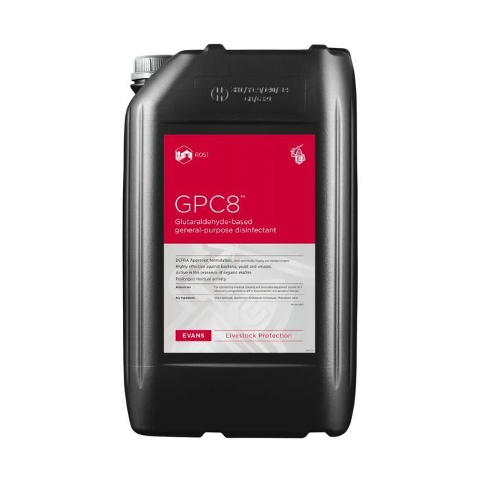 GPC8 is a highly effective, DEFRA approved farm disinfectant perfect for fighting bacteria, viruses and fungi containing two active ingredients Glutaraldehyde and Quaternary Ammonium Compounds.
