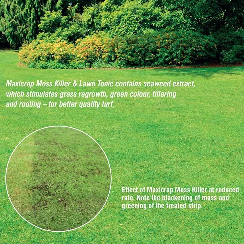 Maxicrop Moss Killer & Conditioner rapidly kills & provides lawn moss control with liquid sulphate of iron & also fertilises the grass with natural seaweed fertilizer & nitrogen for rapid green up.