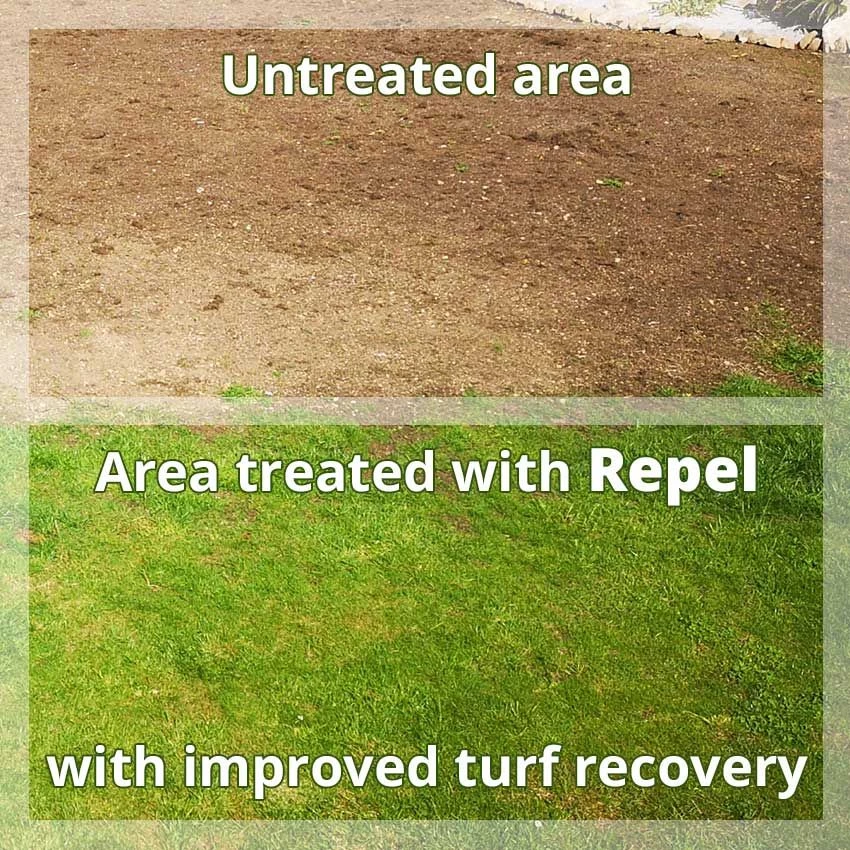 - 50ml of Repel, diluted in 10L water is sufficient to treat 250m2 of turf.